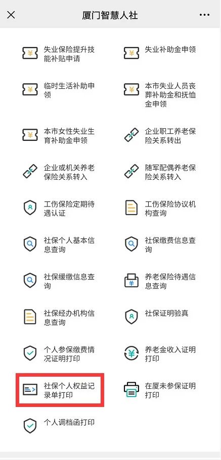 关注“厦门智慧人社”微信公众号。关联用户后,点击“社保个人权益记录单打印”,根据操作指引即可获取。