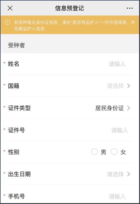 2.依次阅读“新冠疫苗接种告示”、“用户隐私条款”,并进行个人信息预登记。