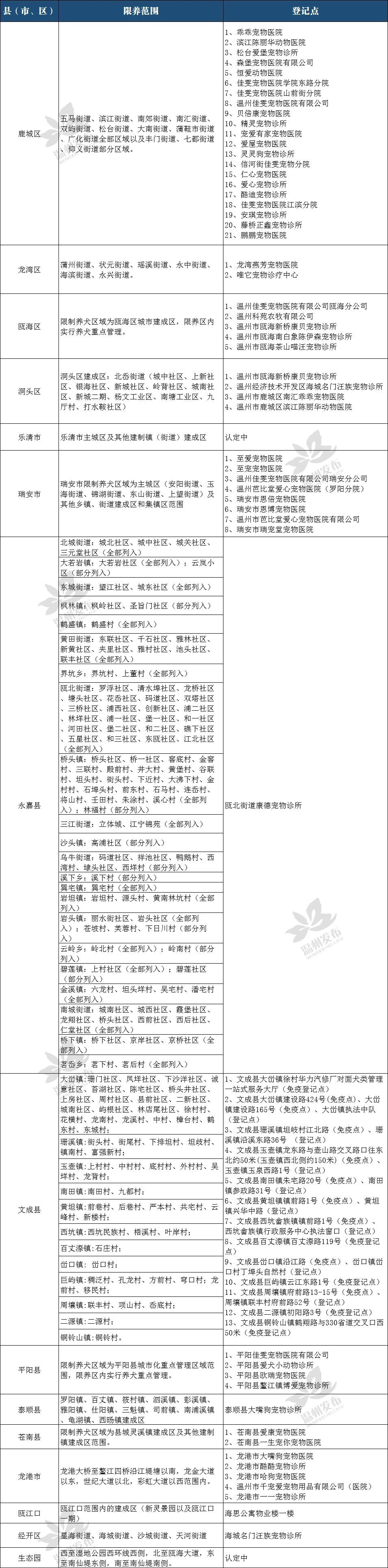 温州市第一批68家犬只免疫、登记点名单