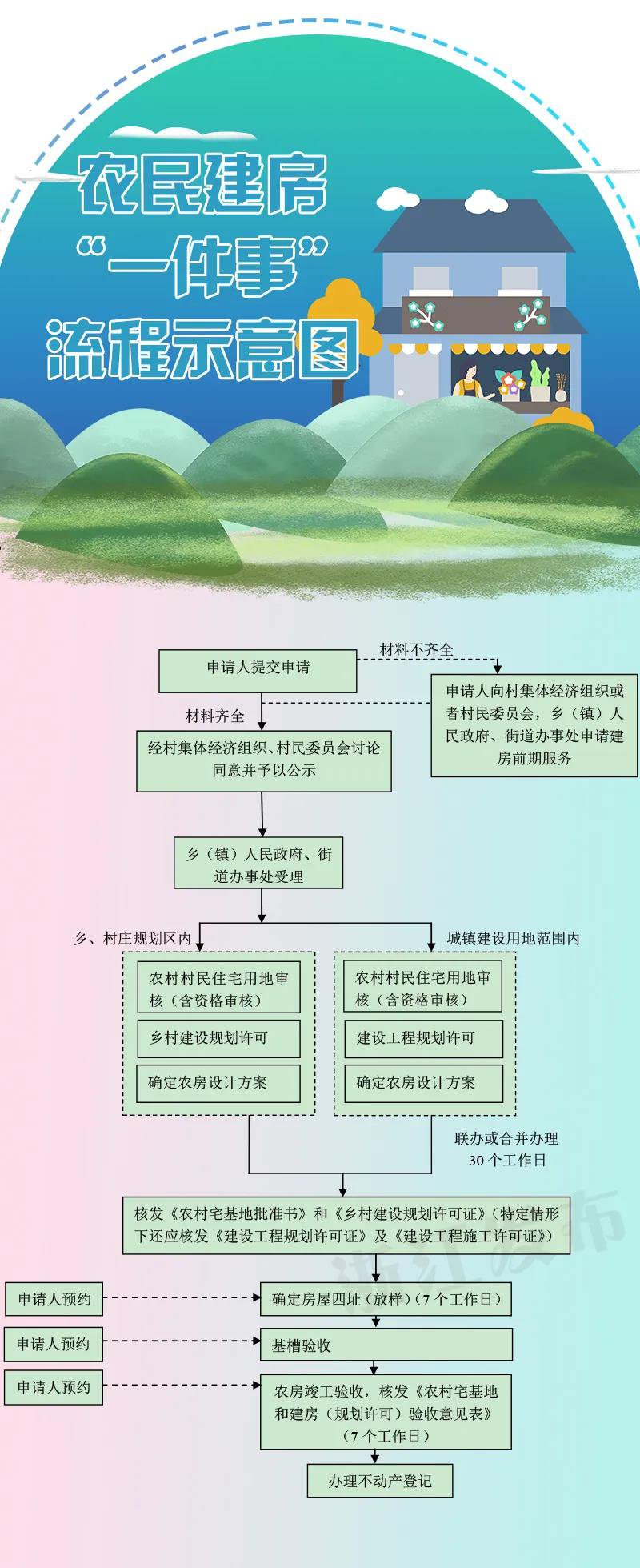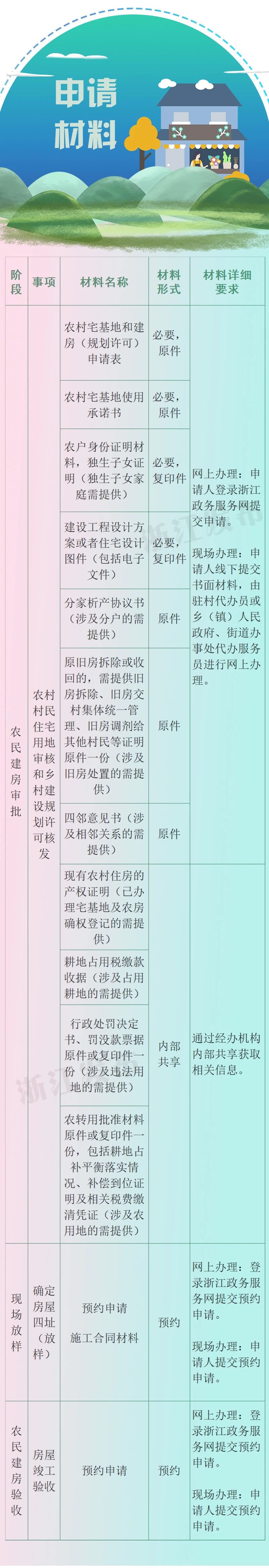 涉及办事事项:农村村民住宅用地审核(含资格审核)、乡村建设规划许可、建设工程规划许可(涉及城镇建设用地范围)、确定农房设计方案、建设工程施工许可、确定房屋四址(放样)、农房竣工验收。