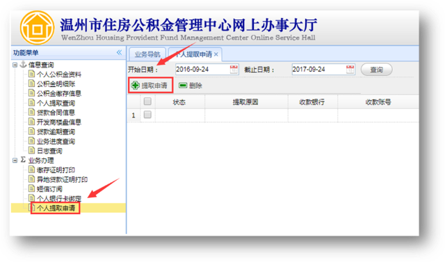 打开个人提取申请,默认会显示未办结的提取申请信息。点【提取申请】按钮打开进行申请登记:
