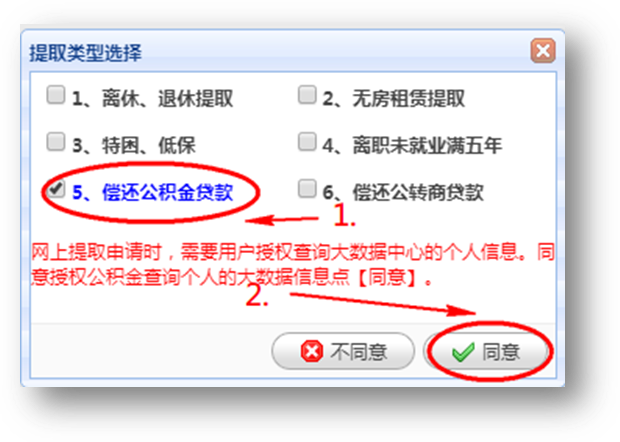 第四步:提取类型选择-偿还公积金贷款,并点【同意】后继续: