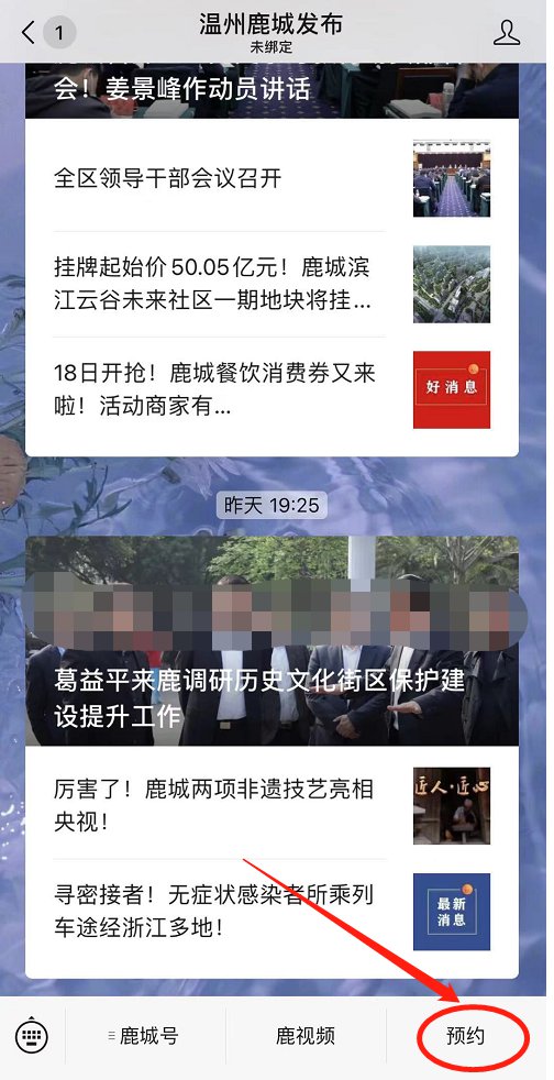1、登陆【温州鹿城发布】鹿城区官方微信,进入页面关注后点击【发消息】在菜单栏点击【预约】