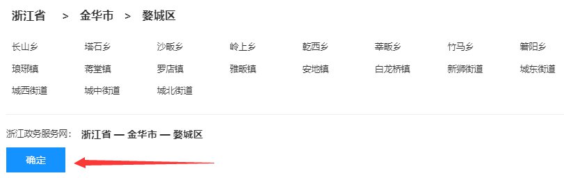 选择金华市,根据自身要求选择下属区、市,点击确定。