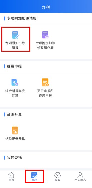 纳税人登录手机个人所得税APP后,可通过“首页——常用业务——专项附加扣除填报”或“办税——专项附加扣除填报”进入专项附加扣除填报界面,并选择“婴幼儿照护费用”专项附加扣除。