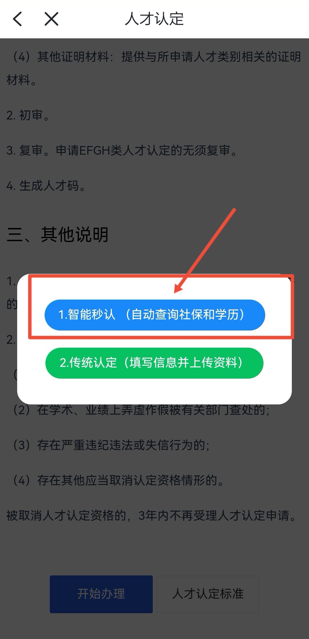 2.在“本地热门应用”中进入“人才认定”,点击“开始认定”,选择“智能认定”