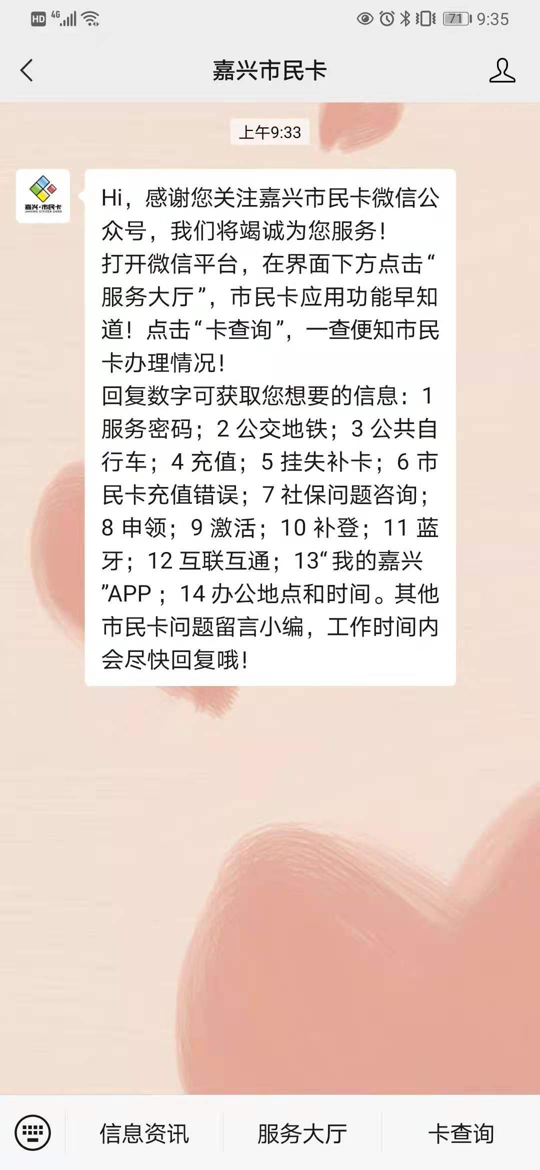 关注“嘉兴市民卡”公众号,进入聊天界面,点击服务大厅。