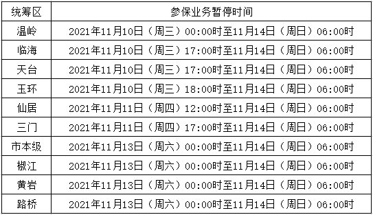 因台州市医保局“全市统一医保信息系统”切换上线的需要,医保部门将对各县(市、区)医保系统分时段做停机切换。我们将根据医保信息系统的切换时间,分时段暂停各县(市、区)“台州利民保”参保业务,现将有关事项公告如下: