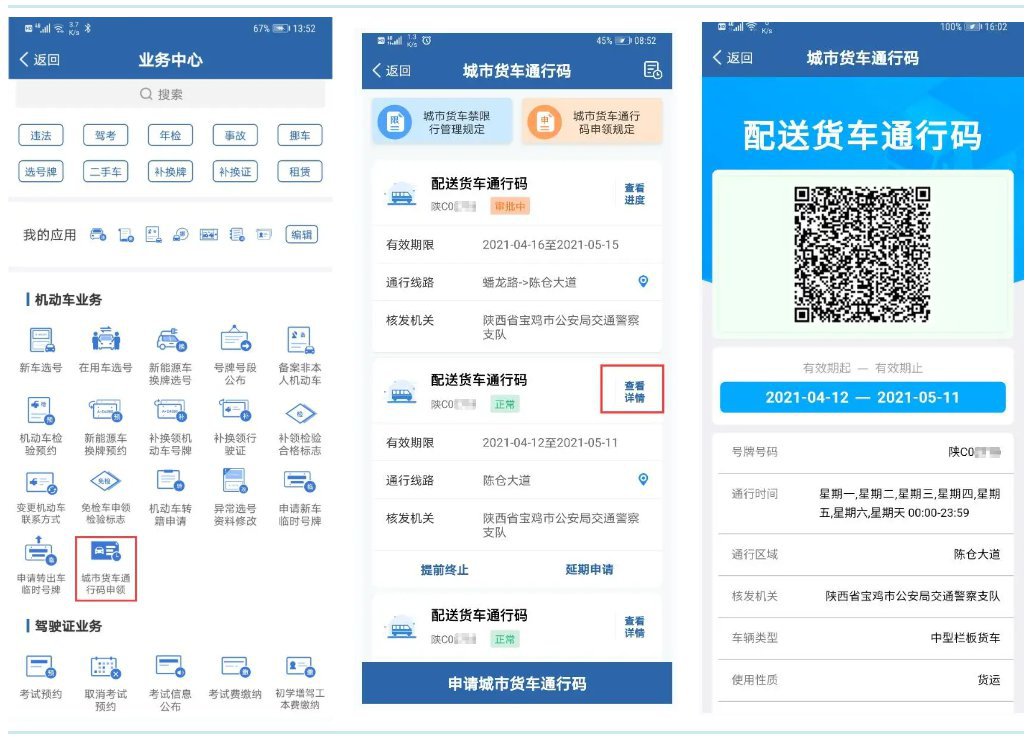 便捷按需申领货车电子通行码:用户通过“申请城市货车通行码”板块,填报具体通行时段、路段或区域等信息,提交相关材料后,即可网上申请办理货车电子通行码。属地公安交管部门将依据本地货车通行码管理制度,在承诺时限及时审核,并反馈处理结果。