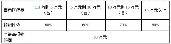 具体报销政策:大病保险实行分段报销,起付线1.3万元,年度累计自负合规医疗费1.3万元——10万元(含),报销60%;10万元——15万元(含)部分,报销70%;15万元以上部分,报销80%。