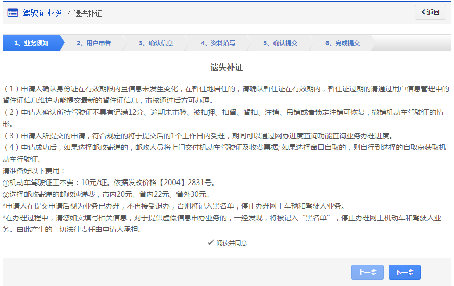 步骤1:【业务须知】在该步骤,用户需认真阅读其内容,包括:办理遗失补证需要注意的各项内容和相关责任,如下图所示。同意的,勾选“阅读并同意”,点击【下一步】进入步骤2【用户申告】。