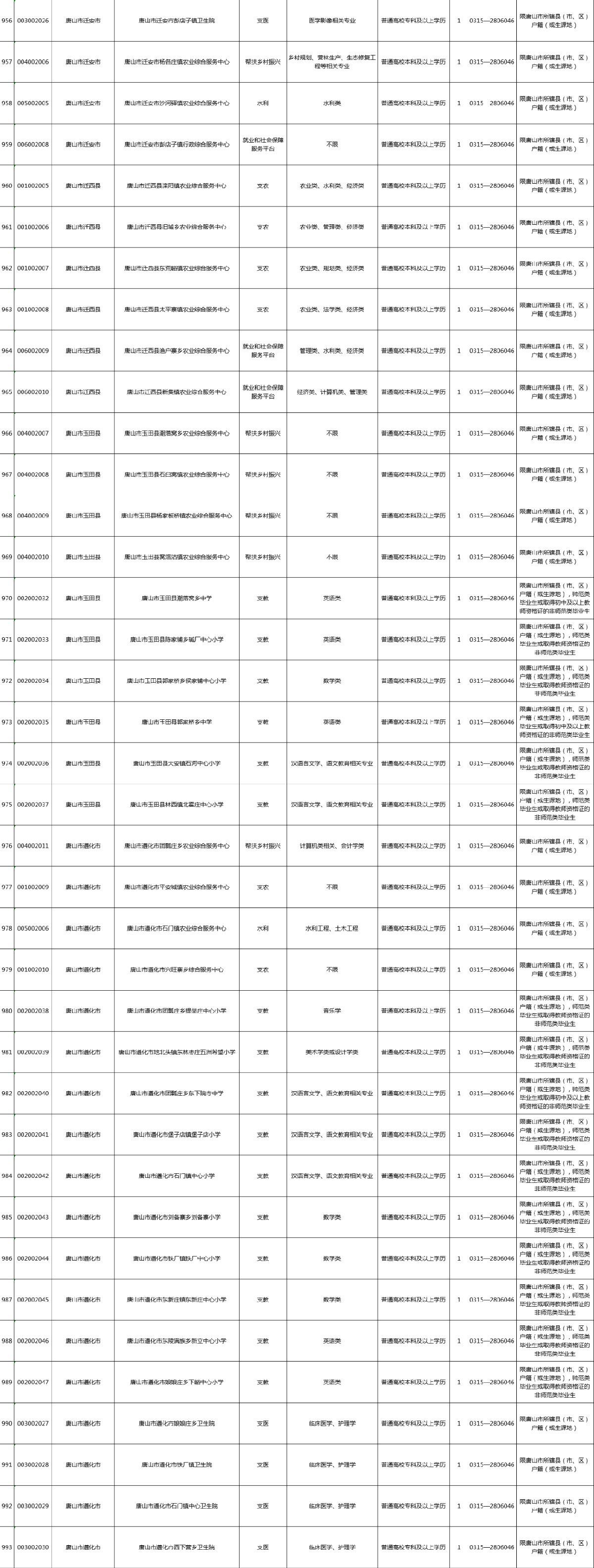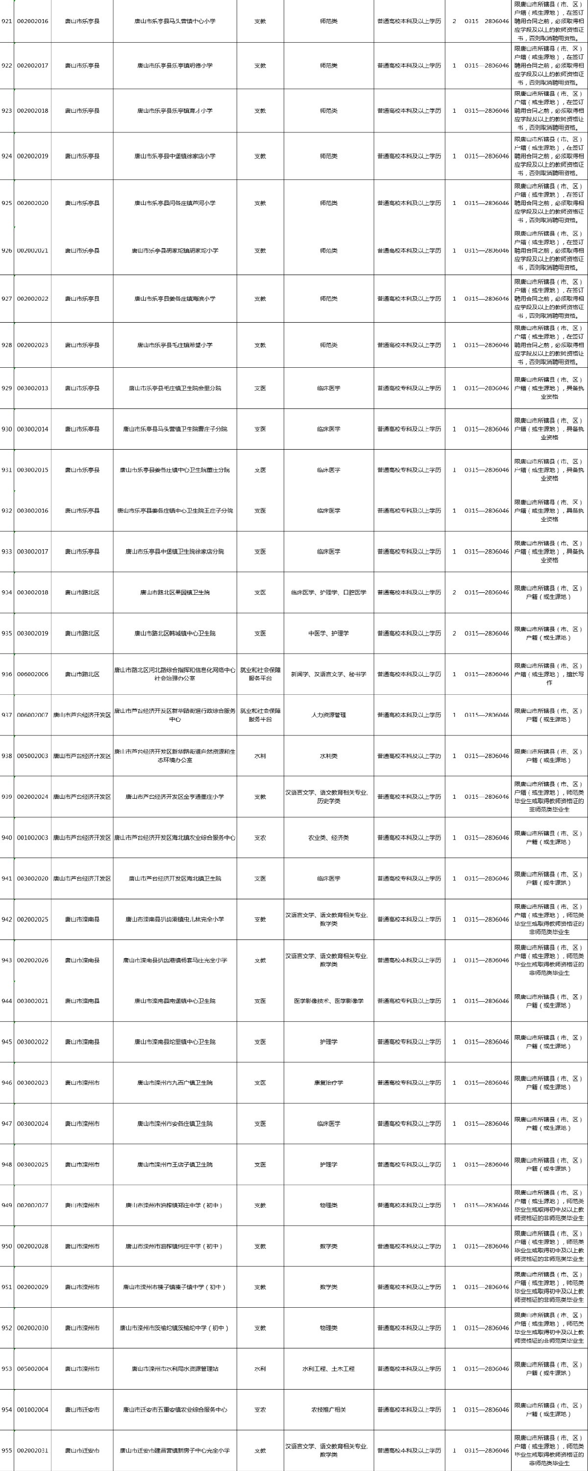 2021年河北省高校毕业生“三支一扶”计划招募岗位信息表(唐山)