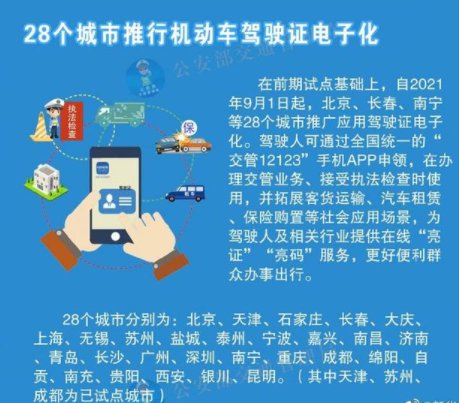 9月1日起,北京等28个城市将推行机动车驾驶证电子化。在天津、成都、苏州3个城市试点机动车驾驶证电子化基础上,北京、长春、南宁等28个城市(名单附后)推广应用驾驶证电子化。通过全国统一的“交管12123”APP发放电子驾驶证,电子驾驶证在全国范围内有效,办理交管业务、接受执法检查时出示使用,并拓展客货运输、汽车租赁、保险购置等社会应用场景,为驾驶人提供在线“亮证”“亮码”服务,进一步简化办事手续资料,提升证件使用便捷度,更好便利群众办事出行。此后,将陆续在全国范围内分阶段实施。