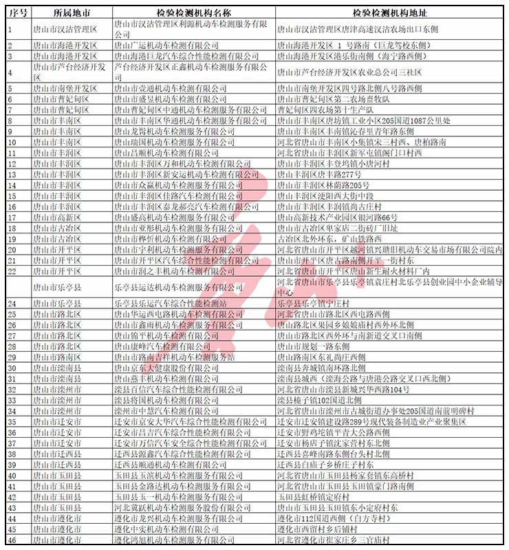 唐山市道路货运车辆“三检合一”机动车检验检测机构名单: