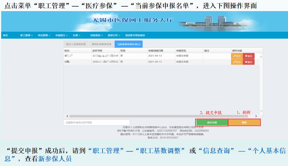 第4步:点击菜单“当前参保申报名单",先点击“刷新”,再点击“提交申报”,即可增员成功。