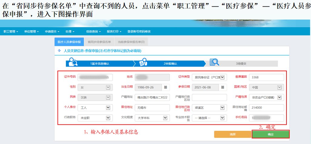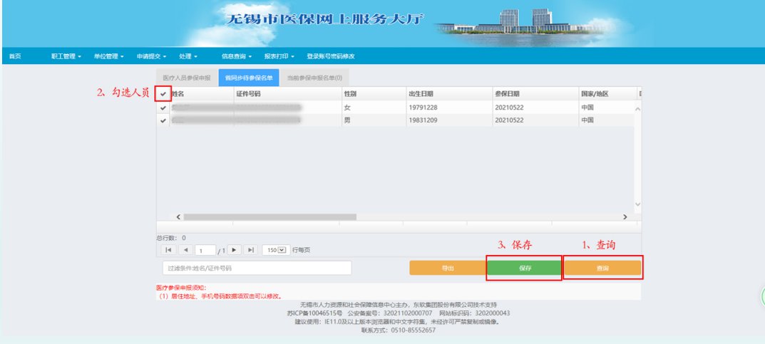 ●第3步:点击菜单"职工管理”一"医疗参保”- - “省同步待参保名单”,先点击“查询”,然后勾选人员,再点击"保存”;若在“省同步待参保名单”中查询不到的人员,则到"医疗人员参保申报”界面填写人员信息后(红色都为必填项),点击“确定”;