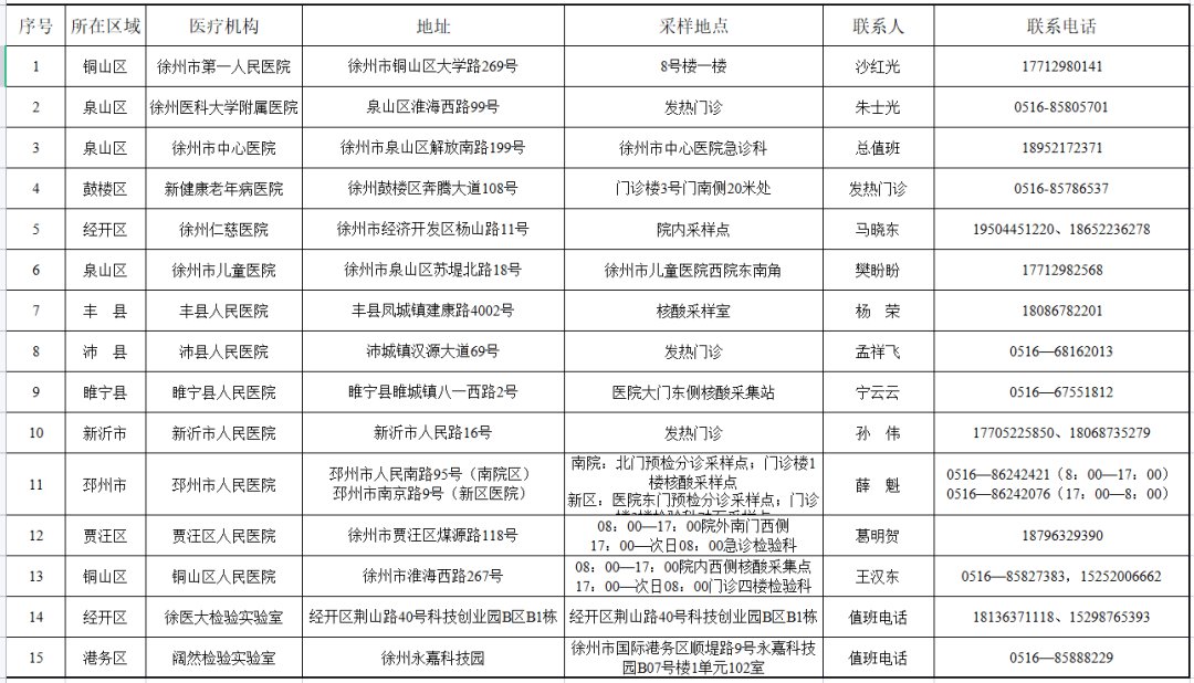 10月29日徐州市卫生健康委发布《关于公布徐州市“愿检尽检”24小时核酸检测采样点的通告》,确定首批15家核酸检测服务机构(名单附后),为广大市民提供24小时核酸采样检测服务。