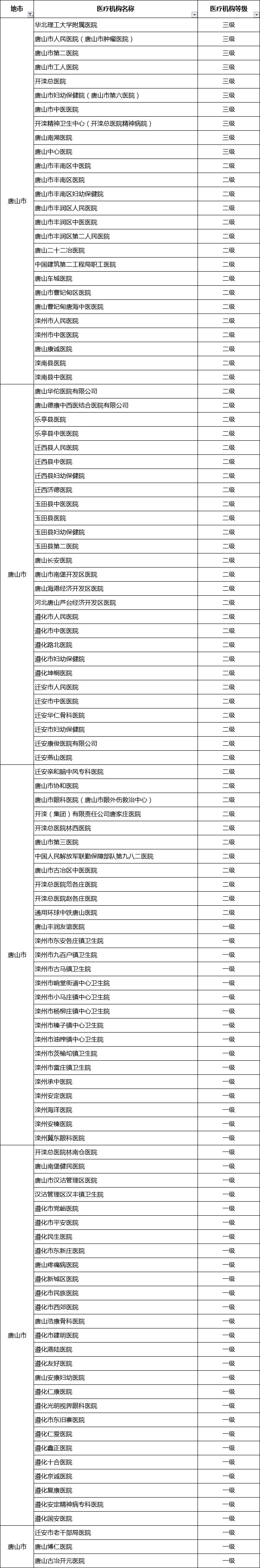 河北省唐山市开通京津冀异地就医普通门诊费用直接结算业务试点定点医疗机构名单(110家)