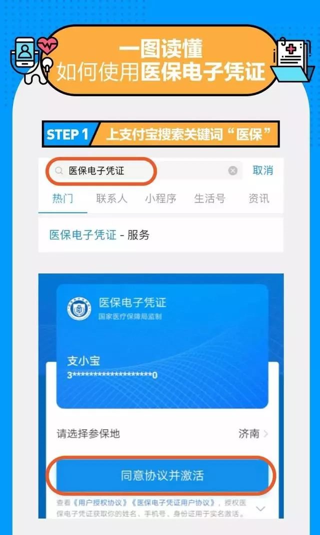 支付宝首页搜索"医保电子凭证",选择参保城市,同意协议并激活,经过刷脸认证后,即可一键领取。