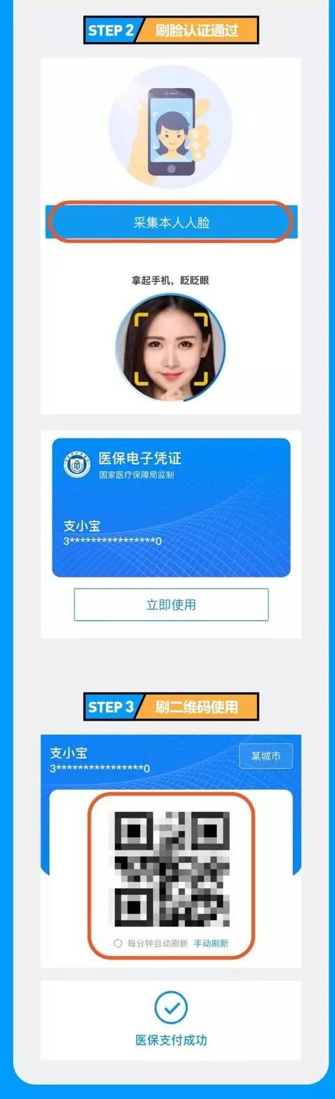 在支付宝首页搜索“医保电子凭证”,同意领取并经过刷脸认证后,即可一键将凭证放入支付宝“卡包”,今后刷手机就能轻松完成医保支付。