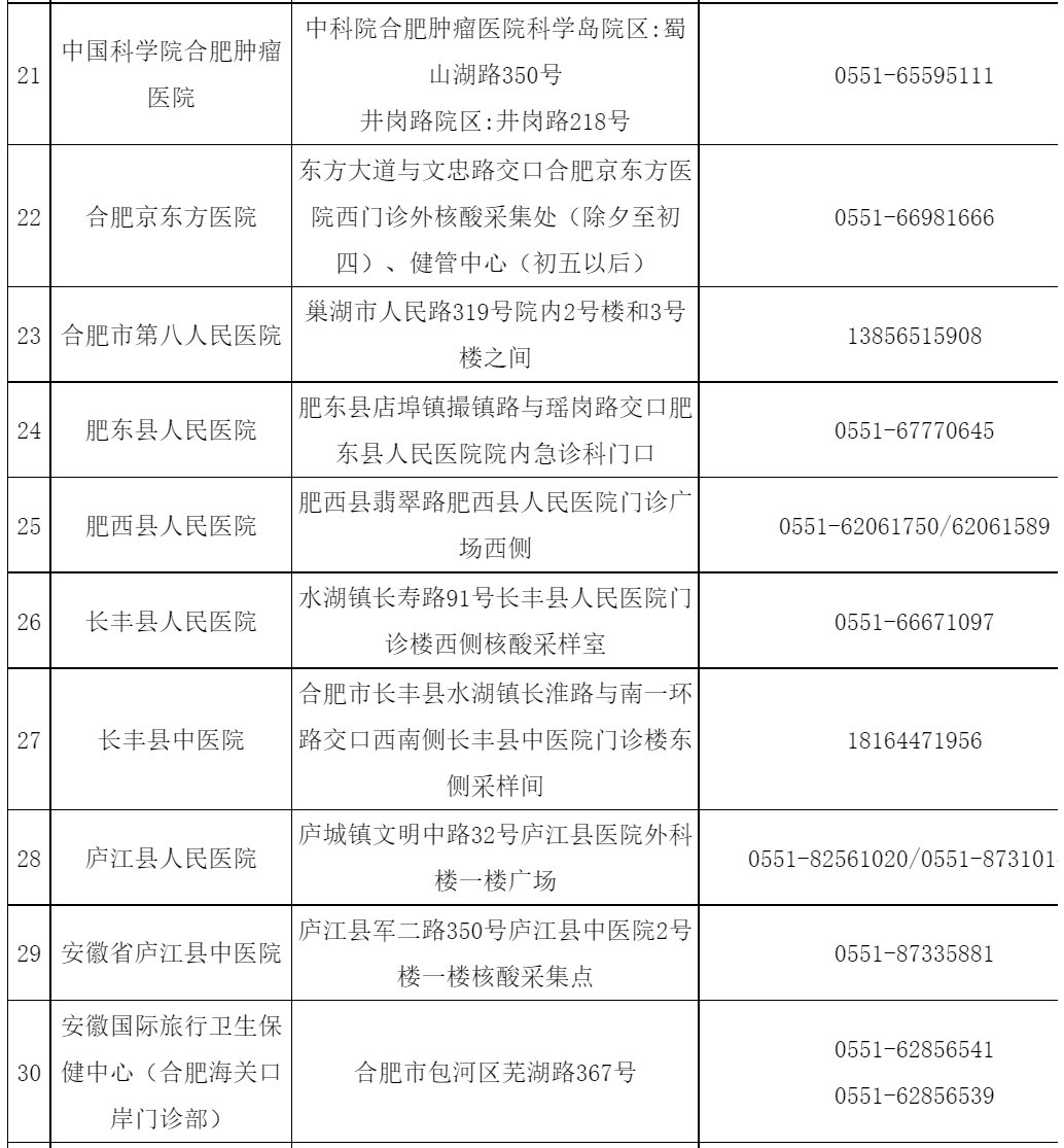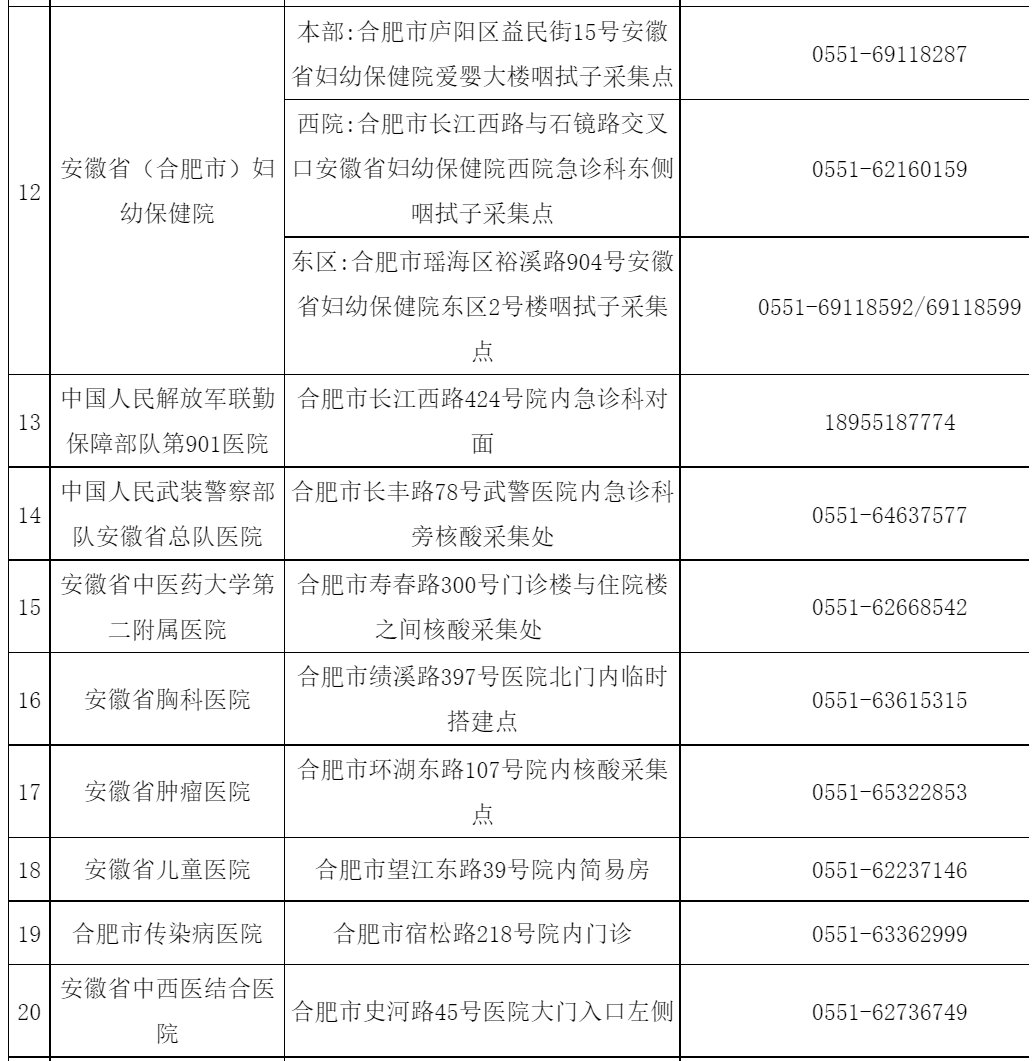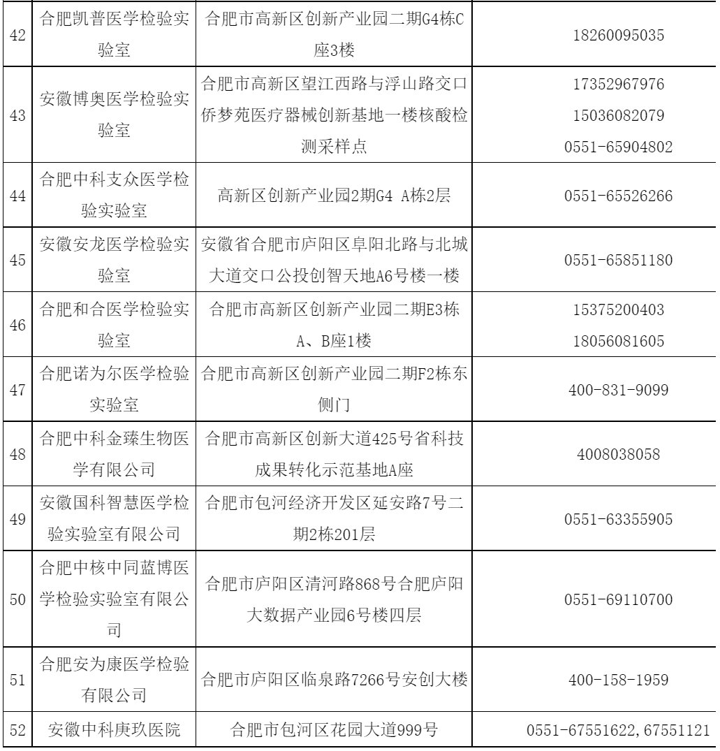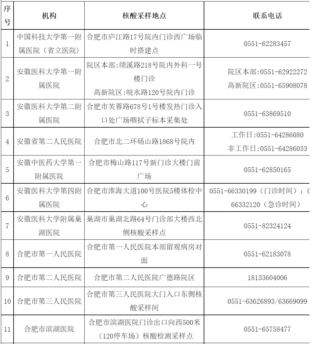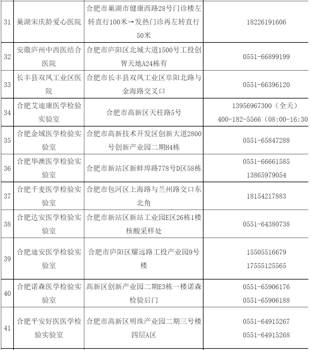 合肥市核酸检测医疗机构信息公布表(更新至2022年1月10日)