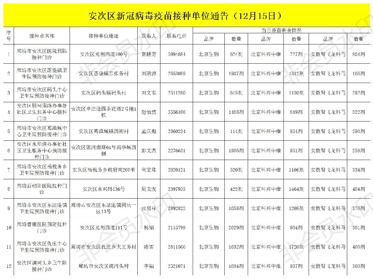 备注:因公告发布时间与接种单位接收上级调拨疫苗时间有一定时间差,偶尔会存在误差情况。请以固定接种点微信公众号发布当日库存信息情况为准