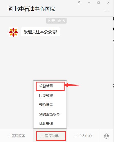 一、关注【河北中石油中心医院】公众号,点击核酸检测