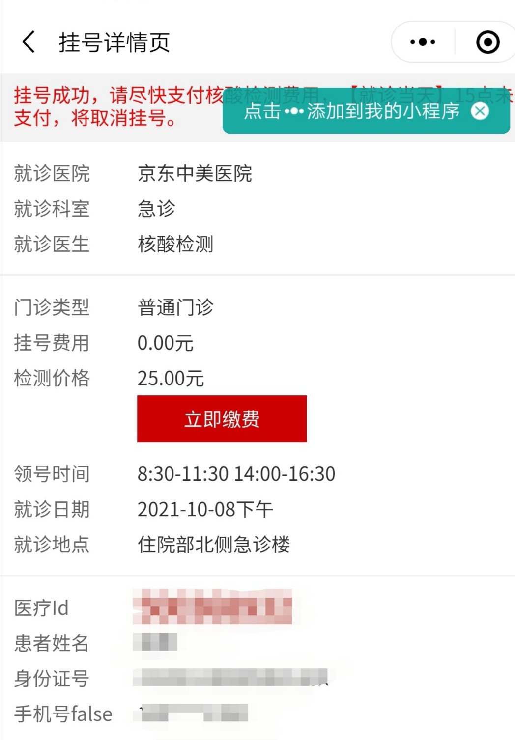 | 检测费用 | 8元/人次(线上挂号缴费) | 40元/人次(现场挂号缴费) |