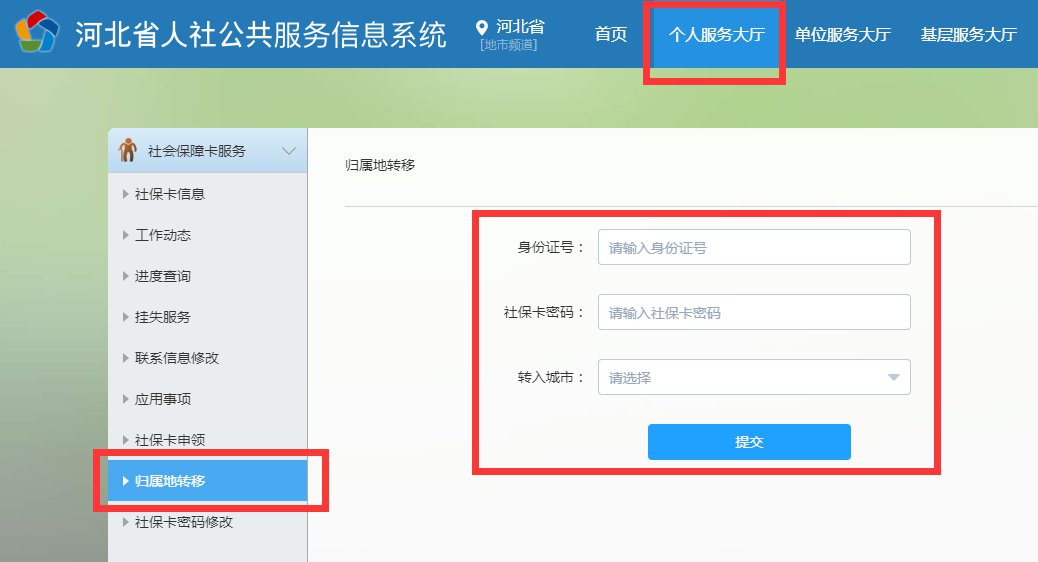 步骤3:点击“归属地转移”,输入身份证号、社保卡密码及转入城市等信息,根据提示操作完成归属地转移业务