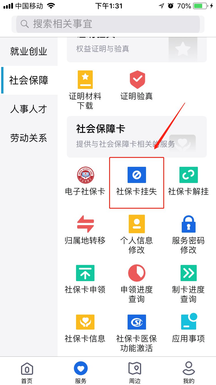 步骤3:点击“挂失服务”,根据提示操作完成挂失业务