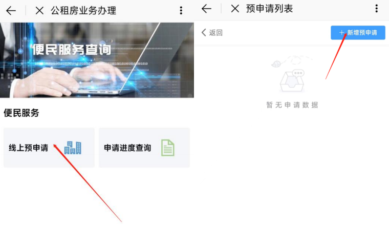 进入公租房办事服务后,点击“线上预申请”菜单,进入预申请列表,新增预申请。