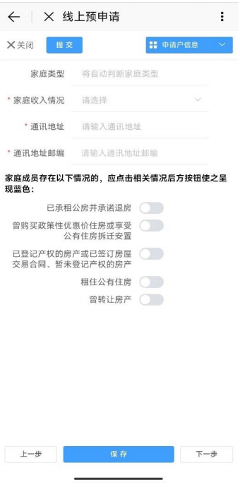 选择本次线上预申请的受理机构以及主申请人的户籍情况、保障方式。
