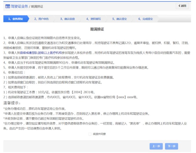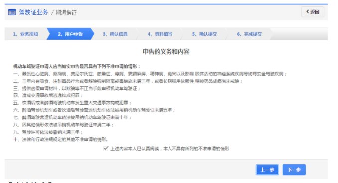 在该步骤,用户需认真阅读其内容,包括:办理期满换证需要注意的各项内容和相关责任,如下图所示。同意的,勾选“阅读并同意”,点击【下一步】进入步骤2【用户申告】。
