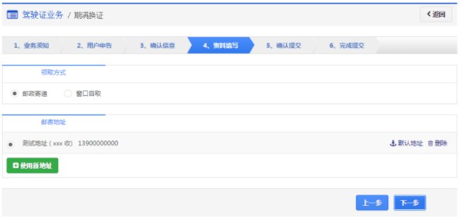 如果选择邮政寄递的方式,用户需认真填写驾驶证邮寄地址等相关信息。用户可以设置默认地址,删除地址,并且使用新地址。点击【使用新地址】,可以新增邮寄地址。