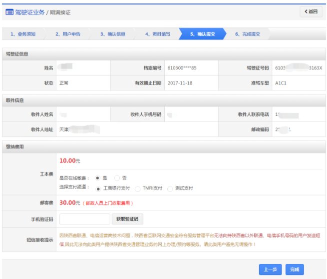 该步骤显示用户的驾驶证信息、领取详情以及需要缴纳费用信息,如果平台已开通在线支付功能,显示在线支付详情。