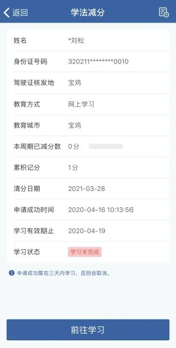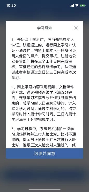 1、已完成受理的,驾驶人用户点击【学法减分】按钮,进入学习界面。