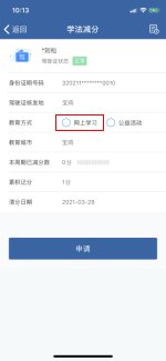 学法减分申请驾驶人用户点击首页业务功能,选择【学习教育业务】模块下->【学法减分】按钮,进入学法减分申请页面。