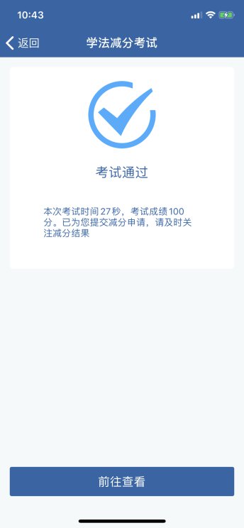 学法减分考试已完成学习的,驾驶人用户点击【学法减分】按钮,在已经完成学习的情况下,点击【前往考试】进入考试,如之前考试没通过且剩余考试次数还有的情况下,点击【前往补考】进入补考。