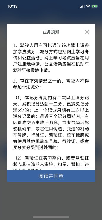 学法减分网上学习已完成受理的,驾驶人用户点击【学法减分】按钮,进入学习界面。