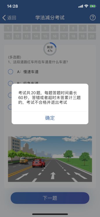 系统随机抽取20道试题,每题限时答题时间60秒,如在倒计时内未完成答题,则系统判断为该题目未答,右上角问号按钮弹框提示用户考试规则。