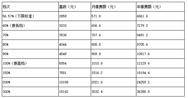注:2020年度湖南职工基本养老保险缴费基准值为5054元/月,下限继续执行2019年最低缴费基数,即最低2859元/月,上限正常调整为5054元/月*3=15162元/月,2859元/月至15162元/月区间内任意整数值均可选择。