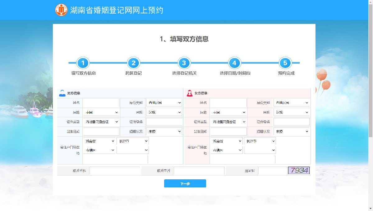 4 结婚双方按实际情况填写双方户籍信息,然后点击下一步。