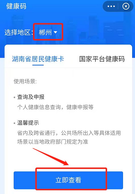 第三步:确保城市是”郴州市“,点击”立即查看“,进入”电子健康卡”申请界面。