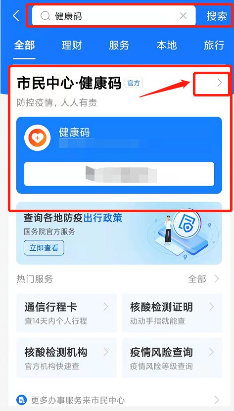 第二步:在“健康码”搜索界面,出现“市民中心·健康码”,点击右侧的“>"进入健康码申领界面。