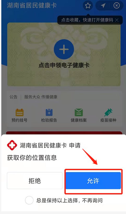 第五步:出现”获取位置信息“提醒,点击”允许“,而后开始申请电子健康卡。