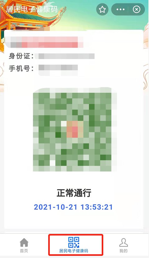 第十步:验证成功后自动返回首页,显示电子健康卡界面,点击”①—电子健康卡右侧的二维码”或“②—页面下方的居民电子健康码”即可进入“健康码”界面。