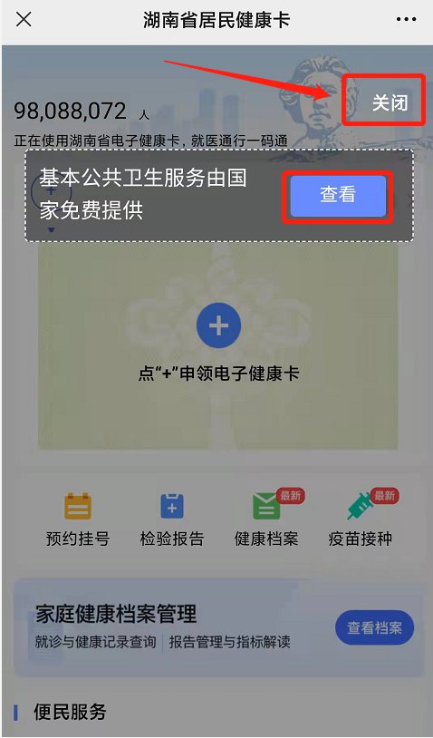 第四步:此步会显示“基本公共卫生服务由国家免费提供”阅读提醒,想了解可点击“查看”,若想直接申领健康码,可点击“关闭”跳过阅读。