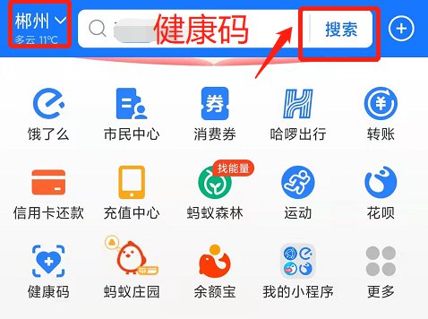 第一步:打开支付宝,切换城市“郴州市”,在搜索框输入“健康码”。