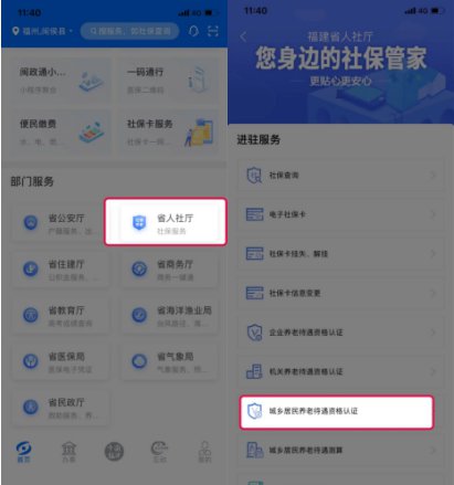 1.用户实名登录闽政通APP,在首页“部门服务”模块点击进入“省人社厅”服务页面,选择“城乡居民养老待遇资格认证”服务(或直接搜索“城乡居民养老待遇资格认证”进入认证页面)。