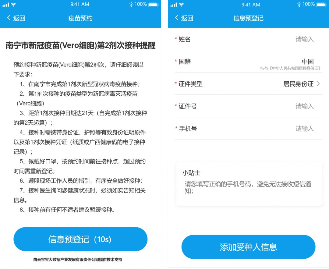 进入系统,依次阅读“南宁市新冠病毒第2剂次疫苗接种提醒”、“用户隐私条款”,并完成个人信息登记。